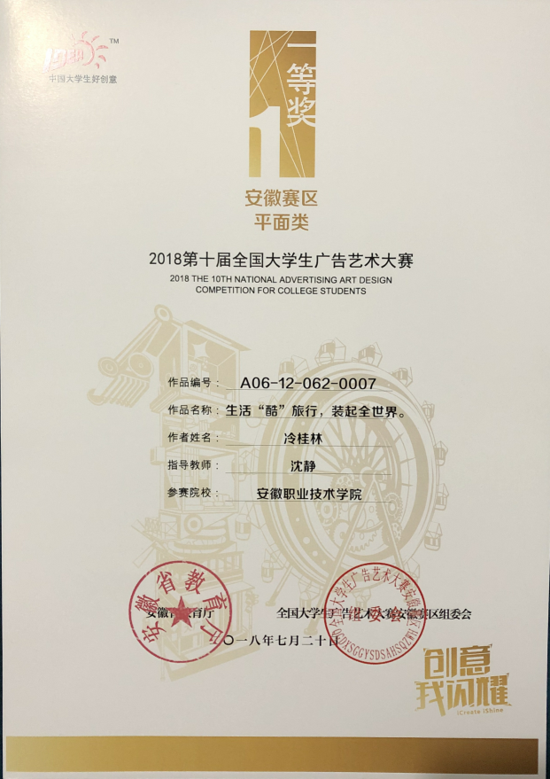 全国大学生广告艺术大赛安徽赛区平面类一等奖(如《开山老物:生活“酷”旅行,装起全世界》《玄冬之约逐岁东方》等)。