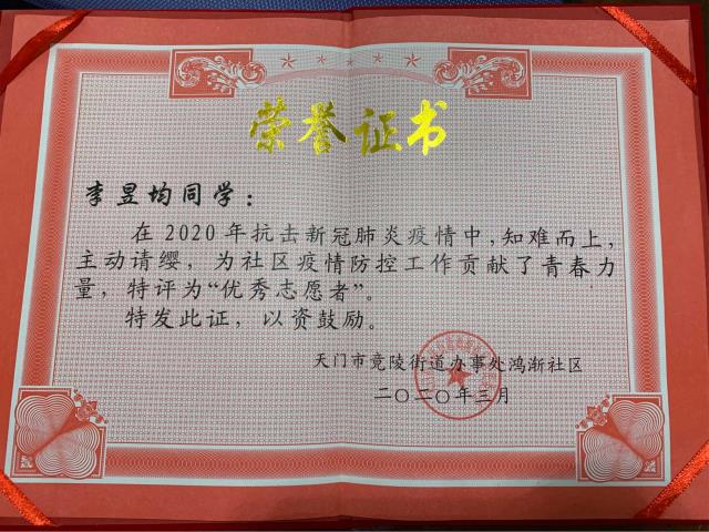 他是一个热爱公益的人。李昱均热爱公益,参与过志愿献血,也积极参加各项志愿活动。2020年初新冠病毒肆虐,身处重灾区湖北省的他,主动请缨,参与到新冠肺炎疫情联防联控中去,投身于防疫一线,顶着寒风值守在道路卡口。一天在值守路口时,有位老爷爷未持有通行证强行闯卡,他将其拦下,见其愁眉不展便询问闯卡原因,老爷爷说道:老伴在烧水时不慎将开水泼到身上,导致身体大面积烫伤,因疫情原因不敢前往医院治疗,只能出来买药。当时有规定,药店购买药品必须由社区开具证明,李昱均便到社区主动向工作人员说明情况,开具了买药证明,在药店购买了烫伤药膏,亲手送到了老爷爷手里。在联防联控工作中,这样的事情不胜枚举,李昱均心怀信仰,不畏困难,恪尽职守,因在防控中表现突出被评为“优秀志愿者”。