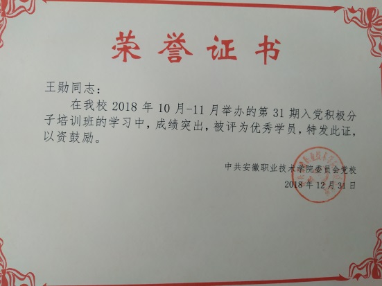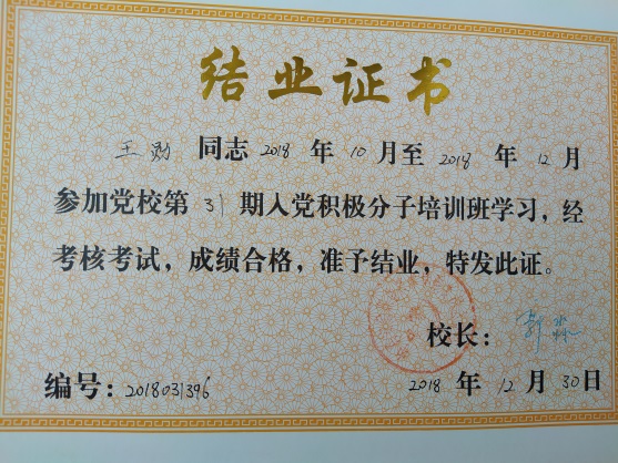 我坚定理想信念,思想上积极进步。从身边的点滴小事做起,严格要求自己,积极地向党组织靠拢,大一上学年,我递交了入党申请书,参加党课学习,党课让我进一步学习了党的基础知识,对党有了更加深刻的了解和认识。第31期党校的结业考核成绩优异,获得“优秀学员”荣誉称号。2020年12月,顺利成为中共党员。我时刻以共产党员的标准来要求自己时刻以先进正确的思想和理念武装自己,永记党的宗旨,全心全意为人民服务。