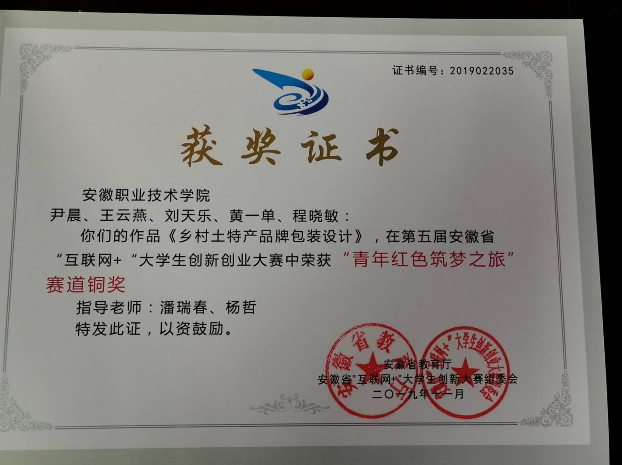 为提高自身创业能力和创新意识,做到全面发展,该同学在大二时参加了校内的SYB创新创业培训进行学习。在社会实践方面,2019年暑假,参加了团委组织的“三下乡”志愿服务及实践活动。该同学所在的队伍前往了安徽淮南八公山乡“中国豆腐第一村”,进行服务和实践。将志愿服务和社会实践与专业相结合,为当地的小商户无偿制作广告的招贴设计和包装的设计,为将来踏入社会积累经验。2019年暑假结束后,便积极的投身到了第五届中国互联网+大学生创新创业大赛中,经过激烈的角逐,该同学所在的队伍获得了省级铜奖。