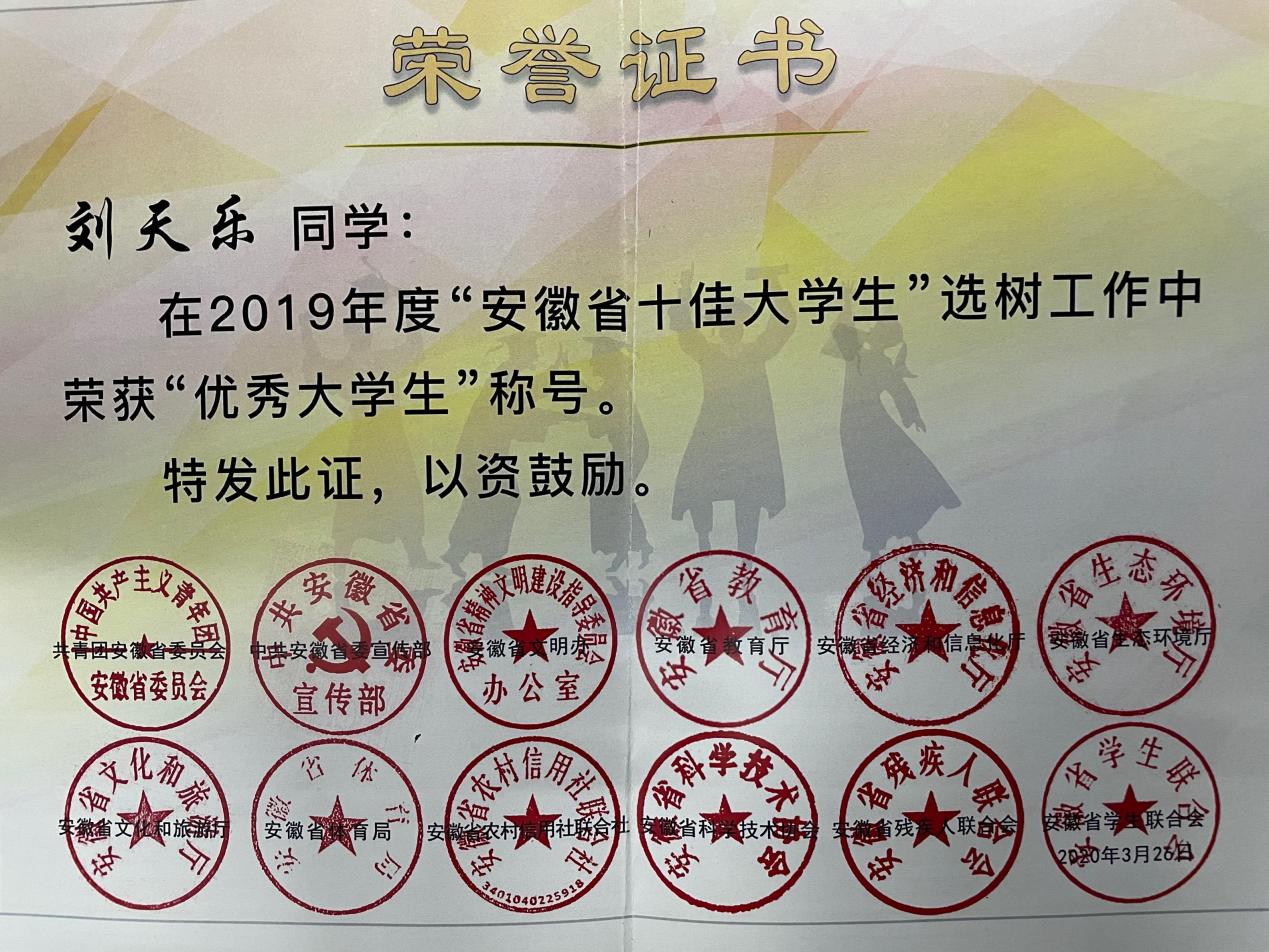 安徽职业技术学院2017-2018年度院级“优秀共青团员”,2018-2019年度校级“优秀共青团员”