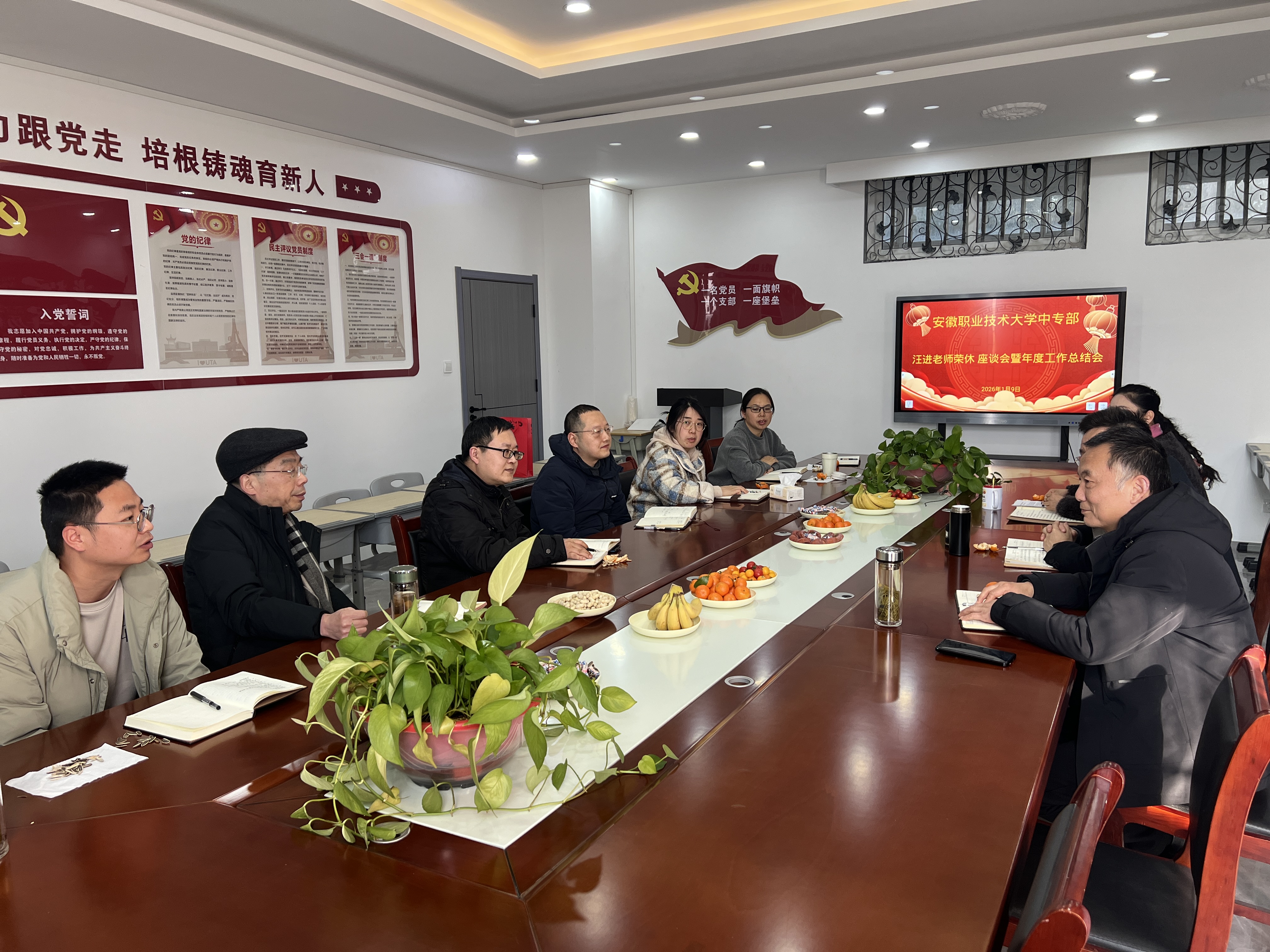 1月9日下午,安徽职业技术大学中专部在复兴楼会议室召开退休教师荣休座谈会暨2025年度工作总结会,会议由中专部副主任王丹主持,院党委委员、中专部主任陈晓春出席,全体教职工参加。
